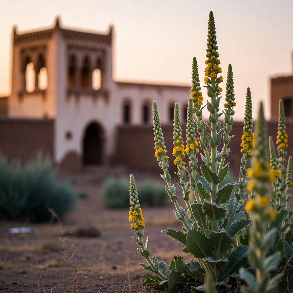 نبات المولّين، المعروف علميًا باسم Verbascum thapsus، عشب طويل القامة يتميز بأوراقه الكبيرة المغطاة بزغب ناعم وأزهاره الصفراء الزاهية. استخدم في أنظمة الطب التقليدي منذ قرون لدعم الصحة العامة.