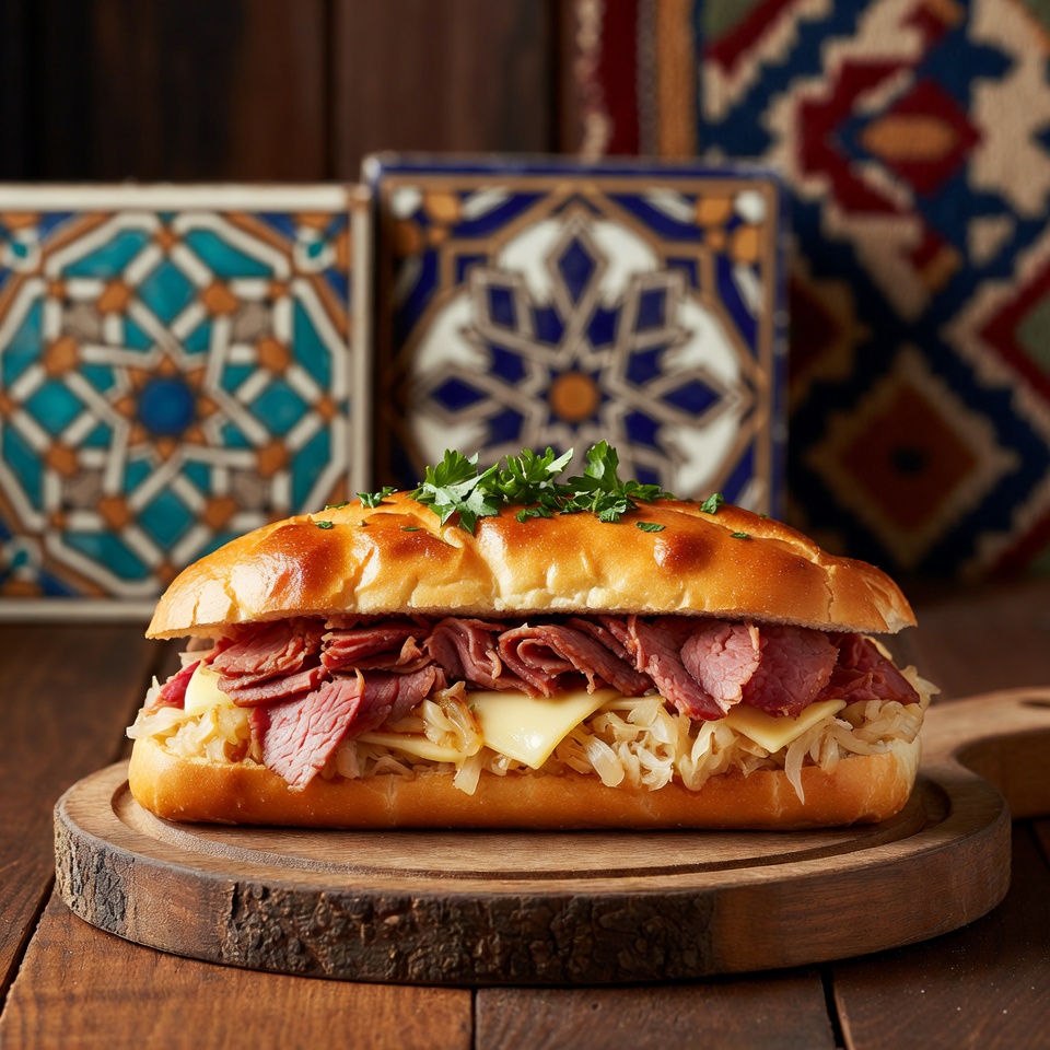 طاجن روبن باللحم المقدد والملفوف المخلل والجبن السويسري