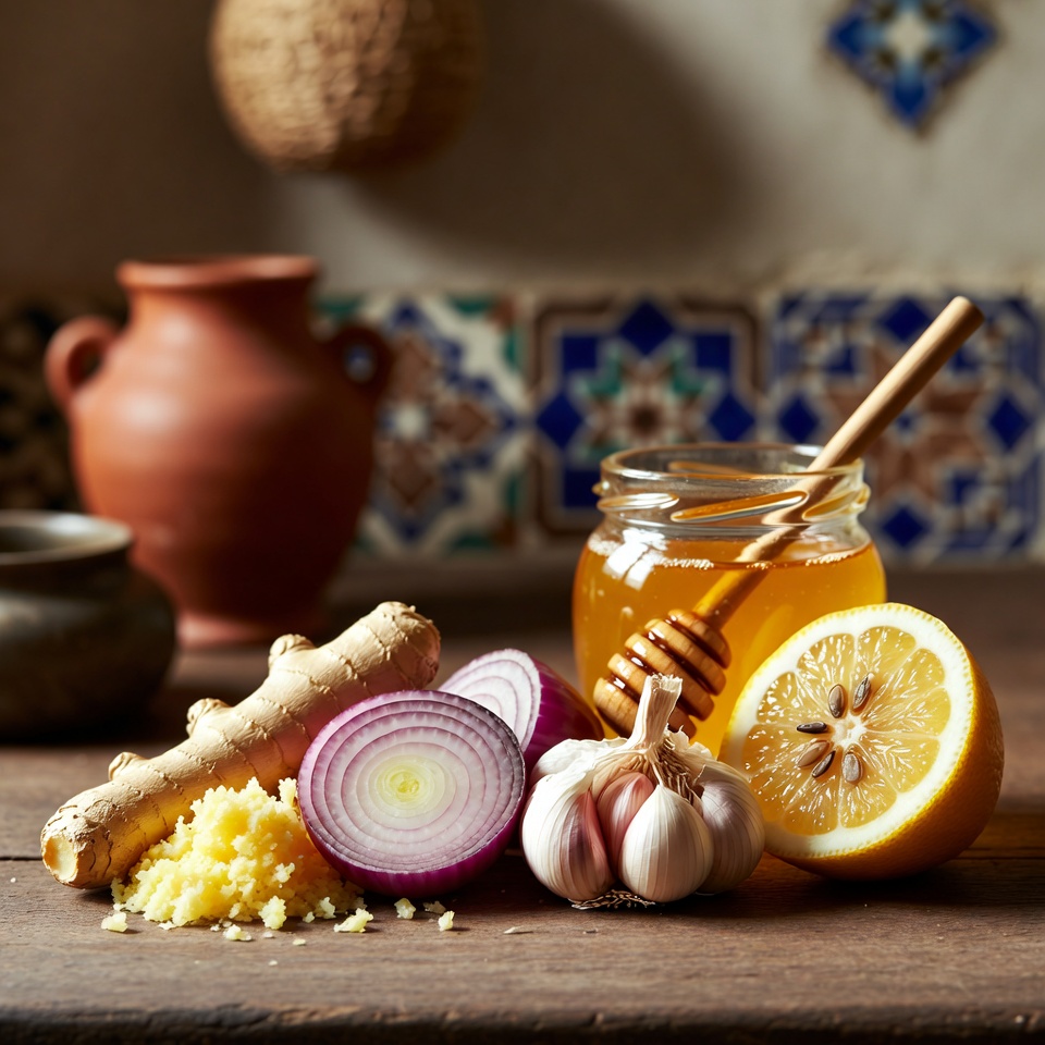 مزيج الزنجبيل، والبصل، والثوم، وعصير الليمون، والعسل هو وصفة طبيعية شائعة يُنظر إليها على أنها مشروب منزلي داعم للمناعة والهضم والحيوية، بفضل ما تحتويه هذه المكونات من فيتامينات، ومضادات أكسدة، ومركبات ذات خصائص مهدئة ومضادة للالتهابات.