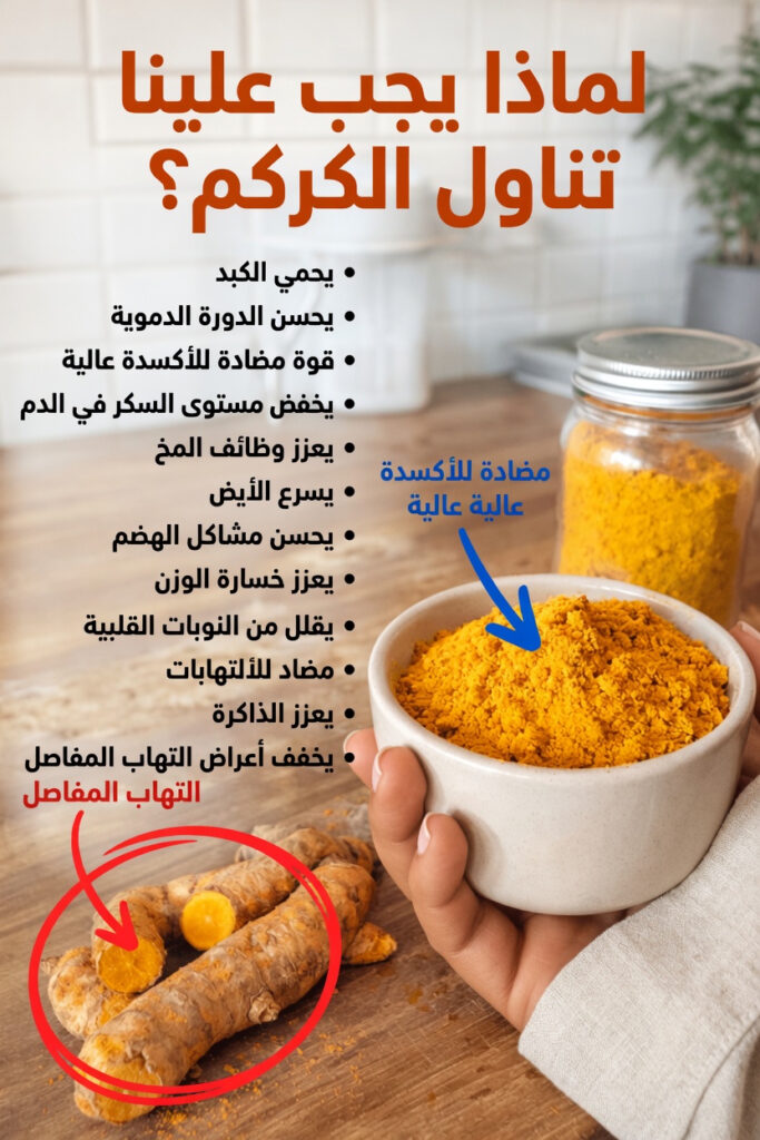 وتذكّر دائمًا أن أي طعام واحد، مهما كانت فوائده، لا يمكن أن يحل محل النظام الغذائي المتوازن والنشاط البدني المنتظم والنوم الجيد. يمكن للكركم أن يكون إضافة رائعة وملونة إلى أسلوب حياة صحي، لكن النتائج قد تختلف من شخص إلى آخر.